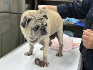 15歳のパグじーちゃん。ボロボロ、満身創痍ってこの事で、爪がこんなに巻いてるって久しぶりだぁ〜。腫瘍もあちこちですね。