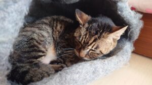 21歳のキジトラ猫さん、飼い主さんより長生きしちゃったね〜。すぐクッションでお休み💤🥰