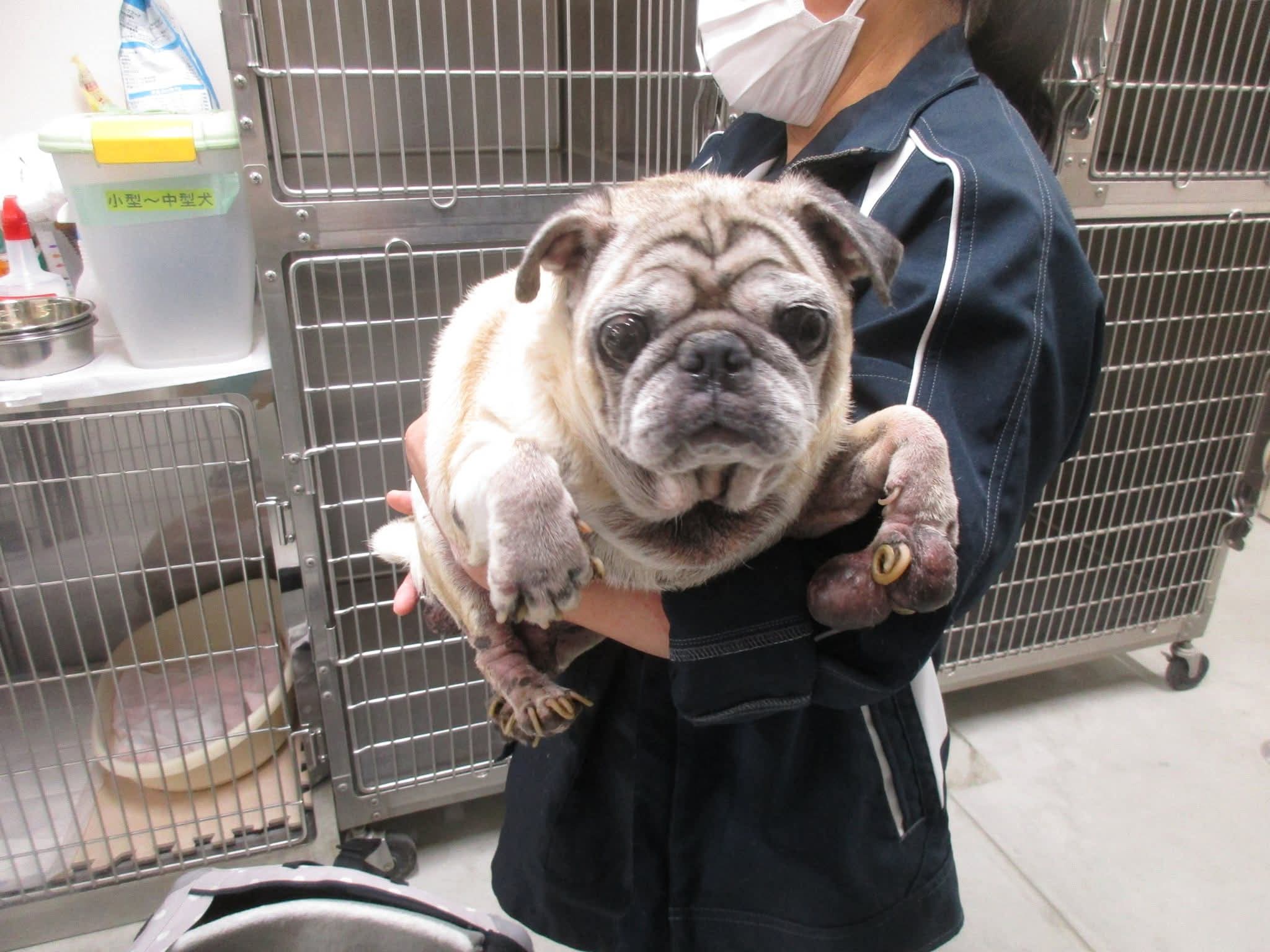 15歳のパグじーちゃん。ボロボロ、満身創痍ってこの事で、爪がこんなに巻いてるって久しぶりだぁ〜。腫瘍もあちこちですね。